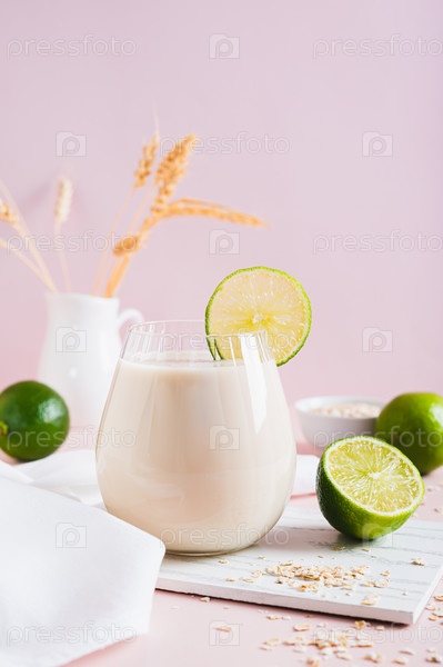 Домашний овсяный напиток из овсяного молока и лайма в стакане на столе, вертикальный вид