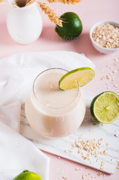 Овсяный модный напиток для похудения из овсянки, воды и лайма в стеклянном вертикальном виде