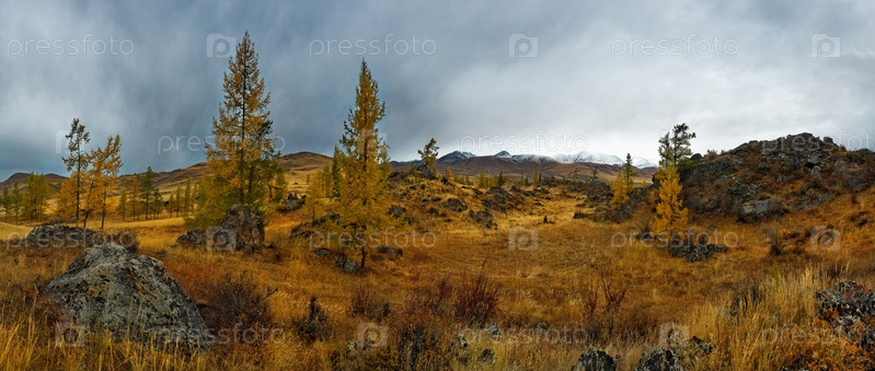 Россия. Юг Западной Сибири, горный Алтай. Начало осени на живописных скалистых местах в Курайской степи вдоль Чуйского тракта