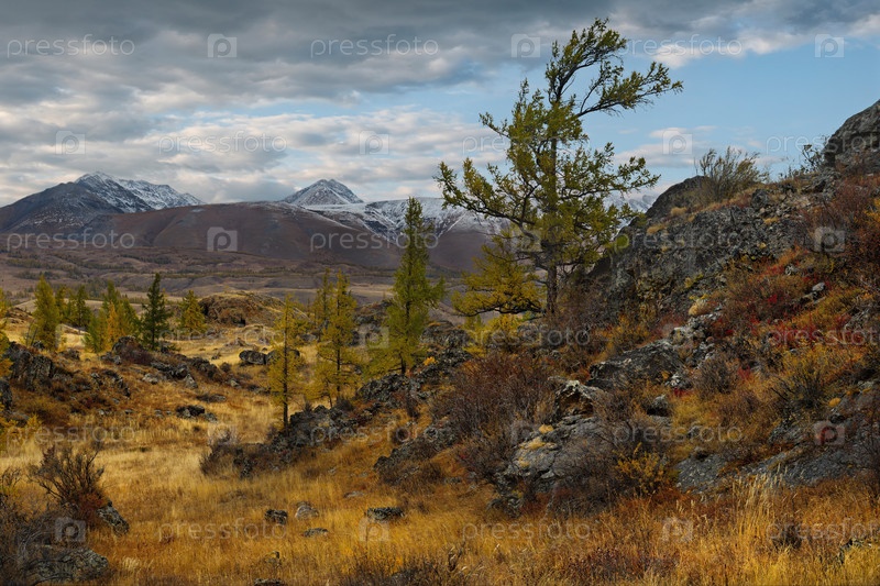 Россия. Юг Западной Сибири, горный Алтай. Начало осени на живописных скалистых местах в Курайской степи вдоль Чуйского тракта
