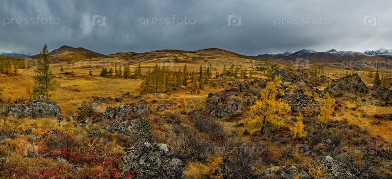 Россия. Юг Западной Сибири, горный Алтай. Начало осени на живописных скалистых местах в Курайской степи вдоль Чуйского тракта