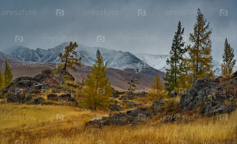 Россия. Юг Западной Сибири, горный Алтай. Начало осени на живописных скалистых местах в Курайской степи вдоль Чуйского тракта