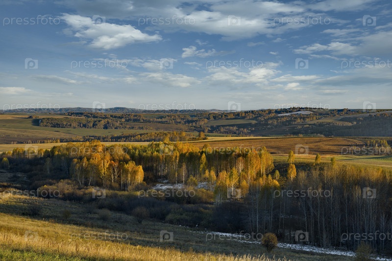 Россия. Юг Западной Сибири, Алтайский край. Вид на бескрайние фермерские поля, над которыми осеннее облачное небо