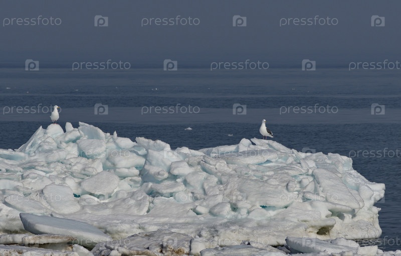 Россия. Западное побережье острова Сахалин. Белые морские чайки на живописных льдинах весеннего Тихого океана