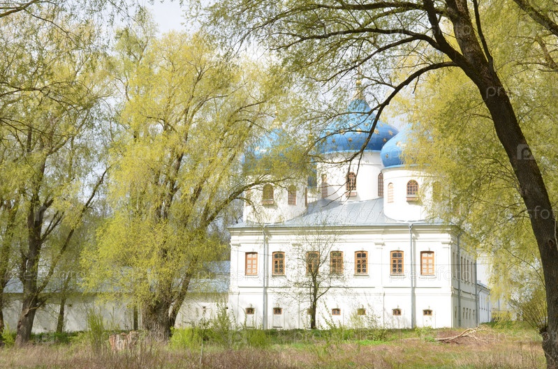 Крестовоздвиженский собор Юрьевского монастыря в Великом Новгороде православный храм XIX века в честь Вознесения Честного и Животворящего Креста Господня с синими куполами и золотыми восьмиконечными звездами на них