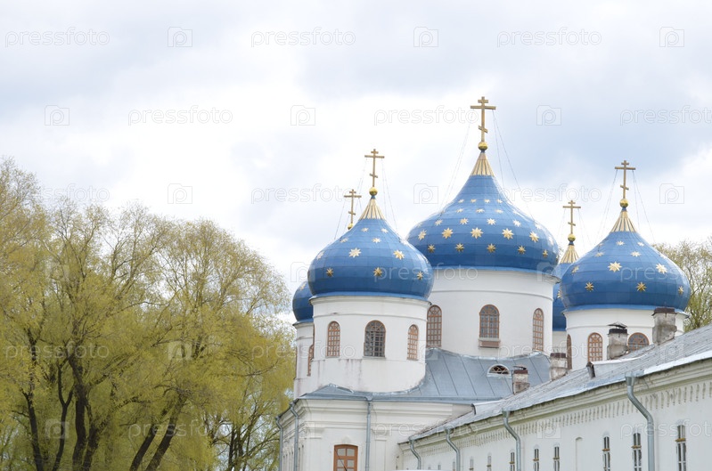 Крестовоздвиженский собор Юрьевского монастыря в Великом Новгороде православный храм XIX века в честь Вознесения Честного и Животворящего Креста Господня с синими куполами и золотыми восьмиконечными звездами на них