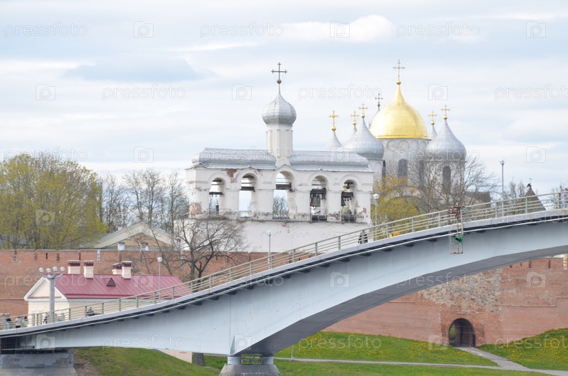 Вид на Кремль Великого Новгорода: Софийский собор (православный храм XI века), Звонница Софийского собора, крепостные стены, Горбатый мост