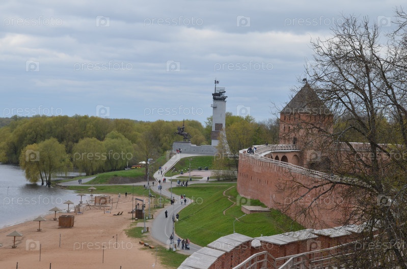 Вид на крепостные стены Кремля Великого Новгорода и Монумент Победы