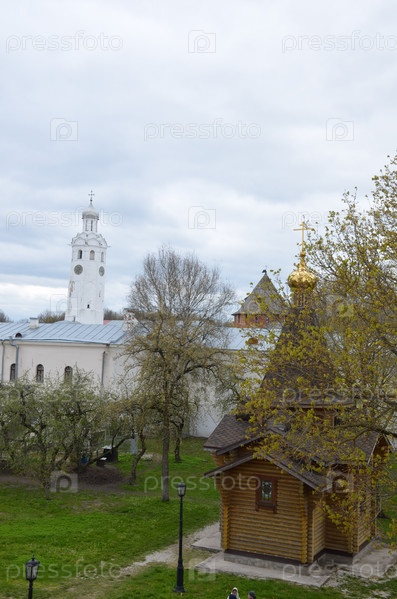 Вид на территорию Кремля Великого Новгорода: Часозвоня (башня с часами), церковь-часовня Владимира Равноапостольного