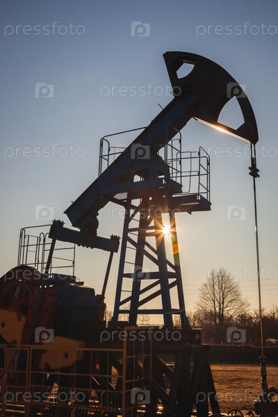 Масляный насос на фоне голубого неба и утреннего солнца, солнечные блики на масляном насосе