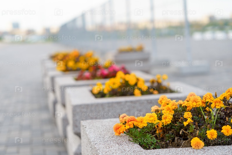 Желтые цветы на клумбах на тротуаре в городе