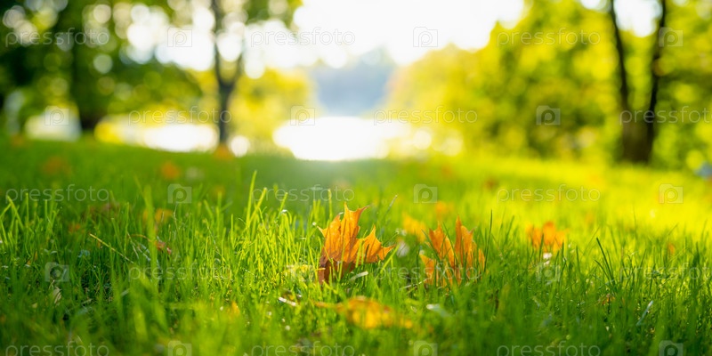 Опавшие желтые листья на траве под ярким осенним солнцем
