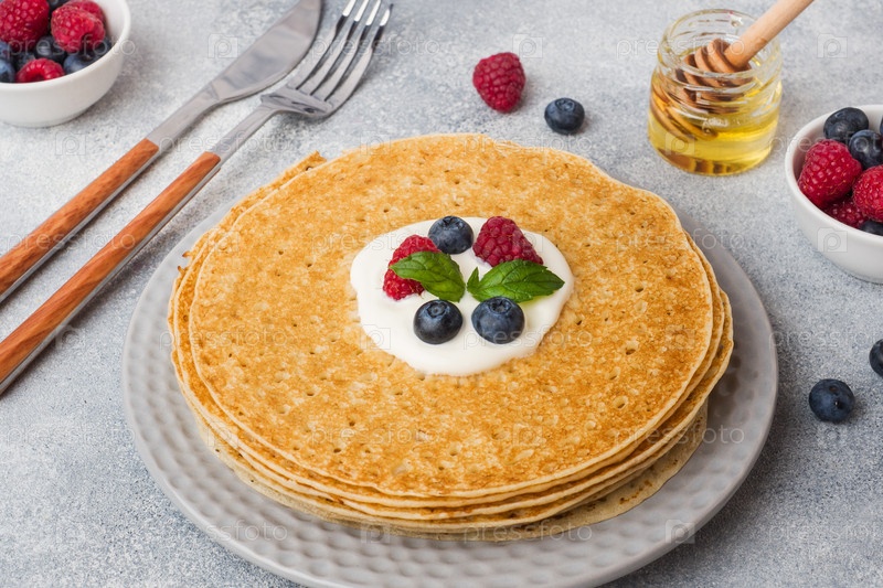 Тарелка вкусных тонких блинов с ягодами на сером столе. Копирование пространства