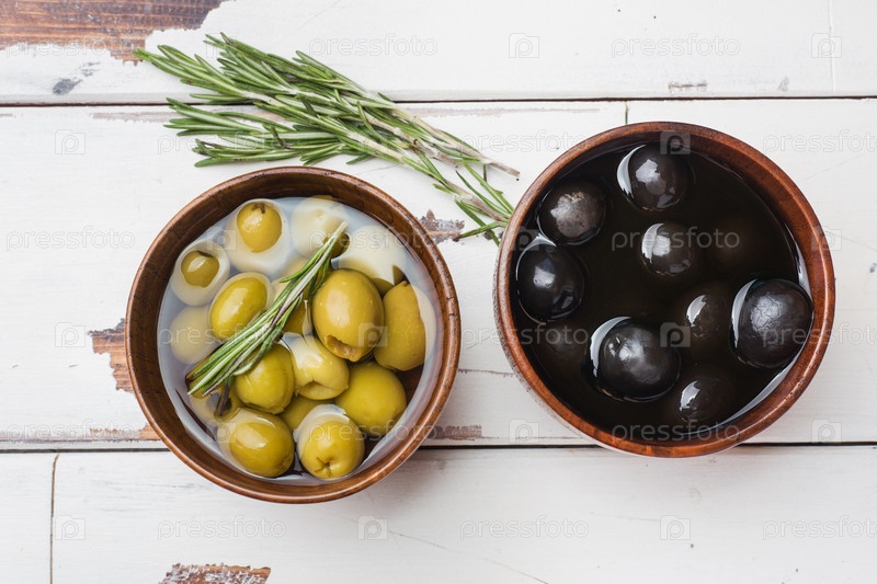 Черные и зеленые оливки в деревянных мисках на деревянном столе. Вид сверху с местом для текста