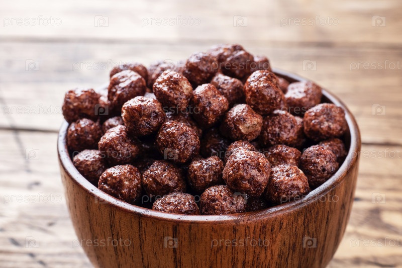Шоколадные хлопья из шариков натуральных злаков сухие на завтрак с молоком. Деревянный стол. Копировать пространство