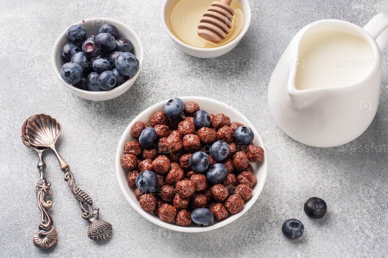 Шоколадные хлопья из натуральных злаков со свежей черникой, медом и молоком. Концепция здорового полноценного завтрака. Серый бетонный фон