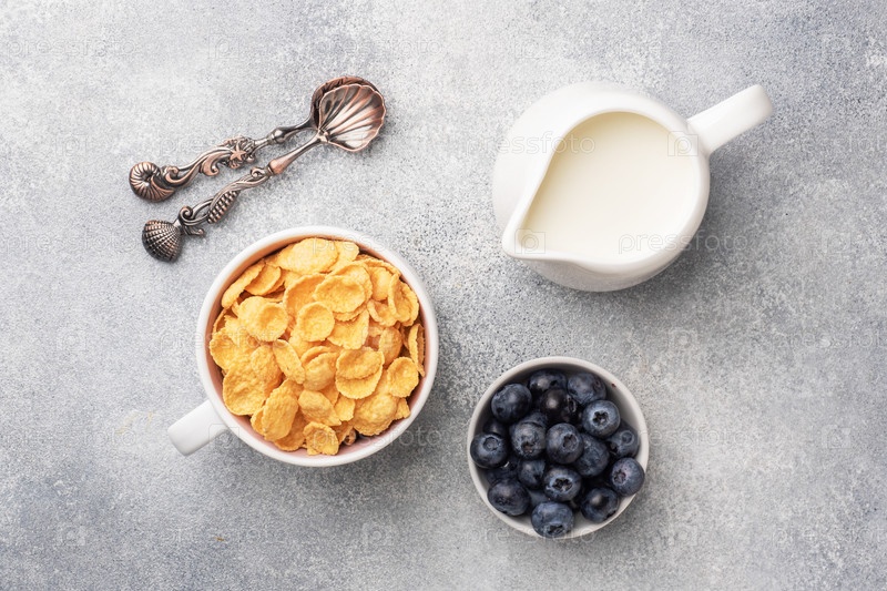 Кукурузные хлопья из натуральных круп со свежей черникой, медом и молоком. Концепция здорового полноценного завтрака. Копия пространства Серый бетонный фон