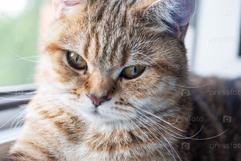 Домашняя кошка сидит на подоконнике и смотрит в окно