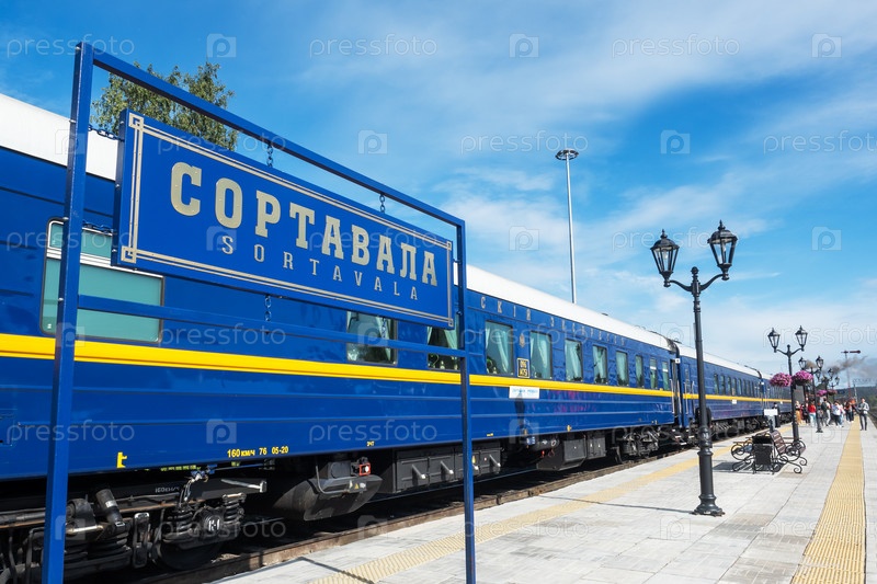 Сортавала, Россия - 7 августа 2020 года: Платформа Сортавала, табличка с названием города и вагоны ретро-поездов следуют по маршруту Сортавала-Рускеала