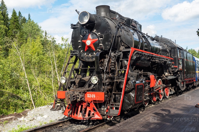Сортавала, Россия - 7 августа 2020 года: Ретро-паровоз на железнодорожной станции Парк Рускеала. Экскурсионный ретро-поезд Сортавала-Рускеала