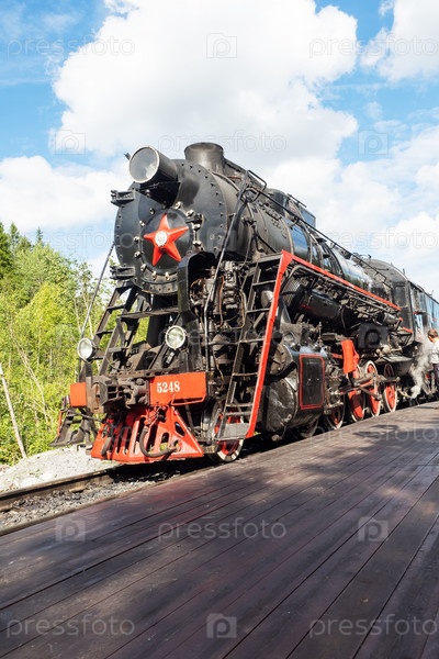 Сортавала, Россия - 7 августа 2020 года: Ретро-паровоз на железнодорожной станции Парк Рускеала. Экскурсионный ретро-поезд Сортавала-Рускеала