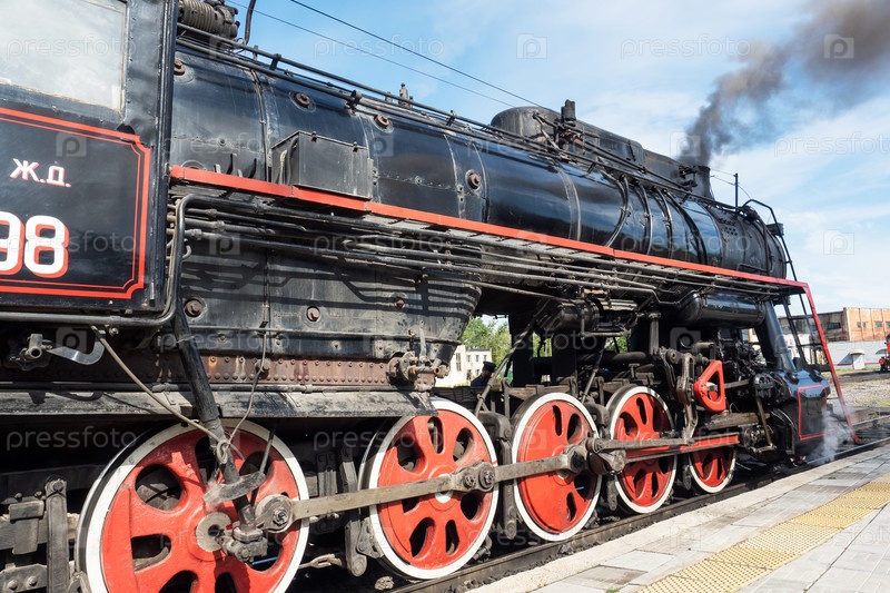 Сортавала, Россия - 7 августа 2020 года: Ретро-локомотив с черным дымом от угольного топлива стоит на железнодорожной станции и готов отправиться по маршруту Сортавала - горный парк Рускеала