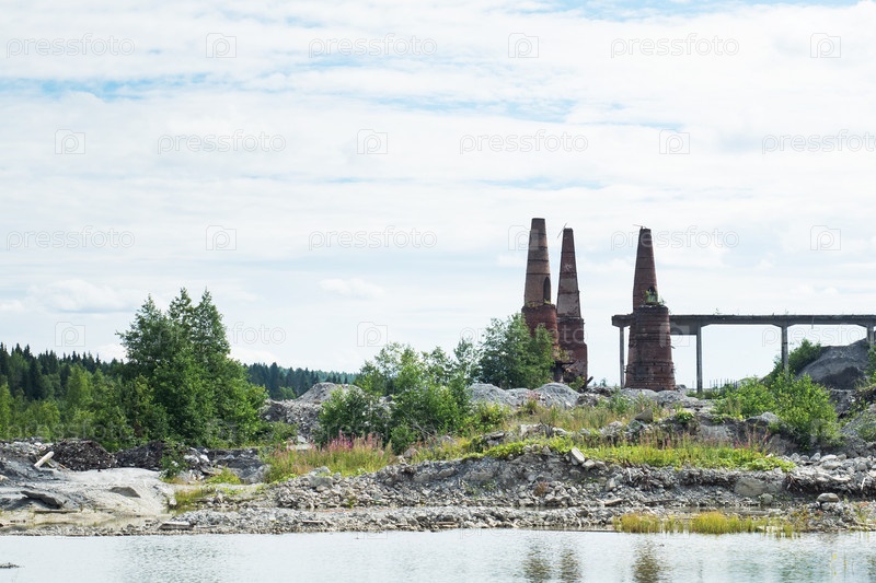 Рускеала, Россия - 7 августа 2020 года: Дымоходы мраморно-известнякового завода горного парка Рускеала. Пейзаж мраморного горного карьера