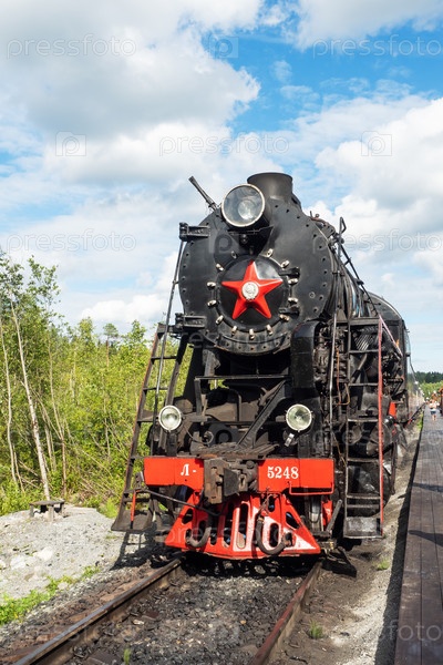 Сортавала, Россия - 7 августа 2020 года: Ретро-паровоз на железнодорожной станции Парк Рускеала. Экскурсионный ретро-поезд Сортавала-Рускеала