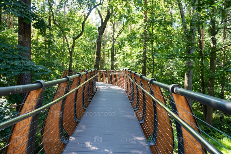 Москва, Россия - 22 августа 2020 г.: Подвесной деревянный мост через парк. Экотропа на ВДНХ Экологический способ путешествовать по лесу