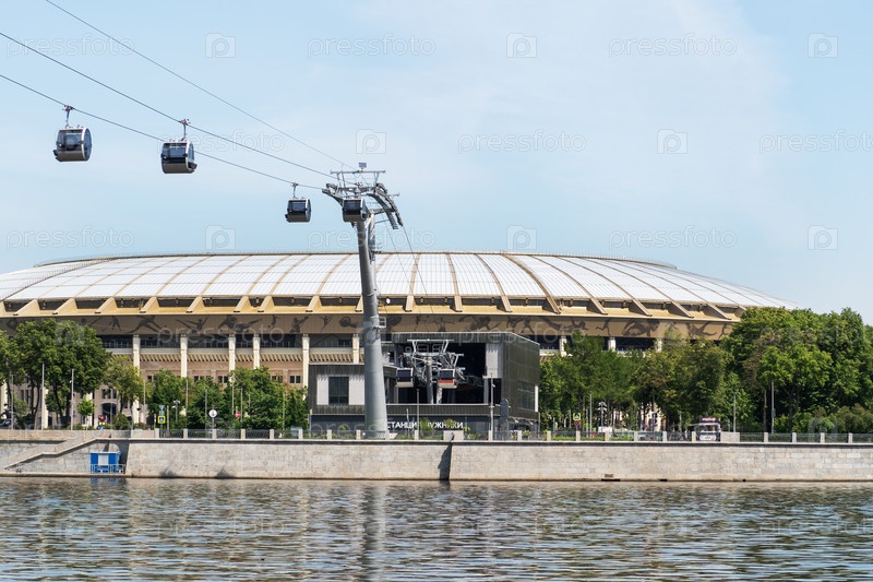 Московская область, Россия - 25 июня 2020 года: Канатная дорога Москва Воробьевы горы, Лужники. Вид на Москву-реку и спортивный стадион «Лужники»