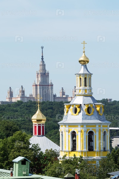 Московская область, Россия - 25 июня 2020 года: Купола Андреевского монастыря и вид на Московский государственный университет имени Ломоносова