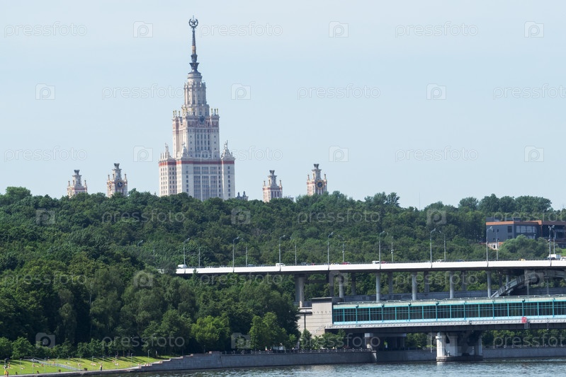 Московская область, Россия - 25 июня 2020 года: Вид на станцию метро "Воробьевы горы", мост через реку и здание МГУ имени М.В. Ломоносова