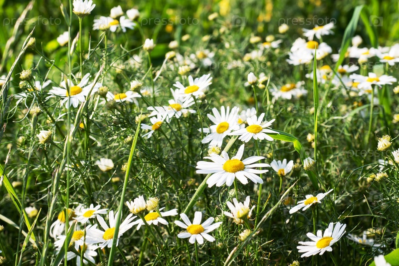 Дикие цветы ромашки на поле в солнечный день. Селективный фокус