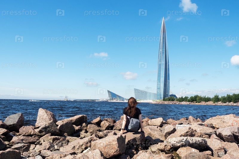 Санкт-Петербург, Россия - 7 августа 2020 года: Шатенка сидит спиной на камнях и смотрит вдаль на море и башню Лахта-центра в Санкт-Петербурге