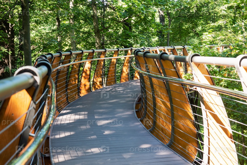 Москва, Россия - 22 августа 2020 г.: Подвесной деревянный мост через парк. Экотропа на ВДНХ Экологический способ путешествовать по лесу