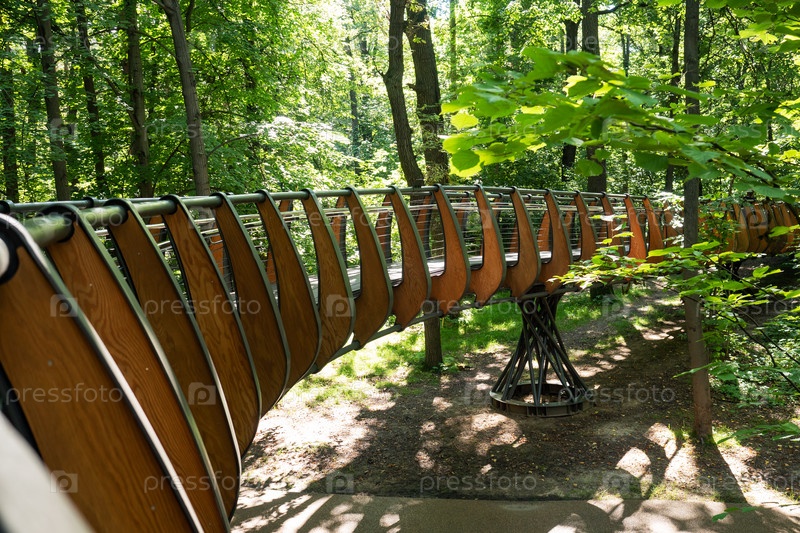 Москва, Россия - 22 августа 2020 г.: Подвесной деревянный мост через парк. Экотропа на ВДНХ Экологический способ путешествовать по лесу