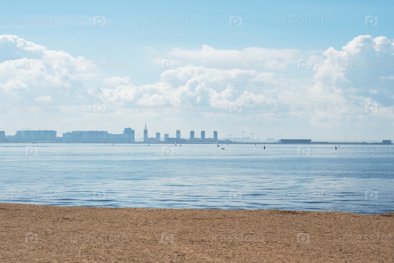 Санкт-Петербург, Россия - 7 августа 2020 года: Морской пейзаж от берега Финского залива до города Санкт-Петербург