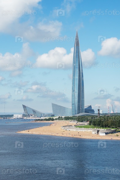 Санкт-Петербург, Россия - 7 августа 2020 года: Вид на башню Лахта-центра в Санкт-Петербурге и Балтийское море, Финский залив. Городской морской пейзаж летом, голубое море и небо