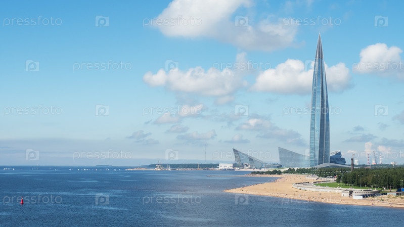 Санкт-Петербург, Россия - 27 августа 2020 года: Вид на башню Лахта-центра в Санкт-Петербурге и Балтийское море, Финский залив. Городской морской пейзаж летом, голубое море и небо