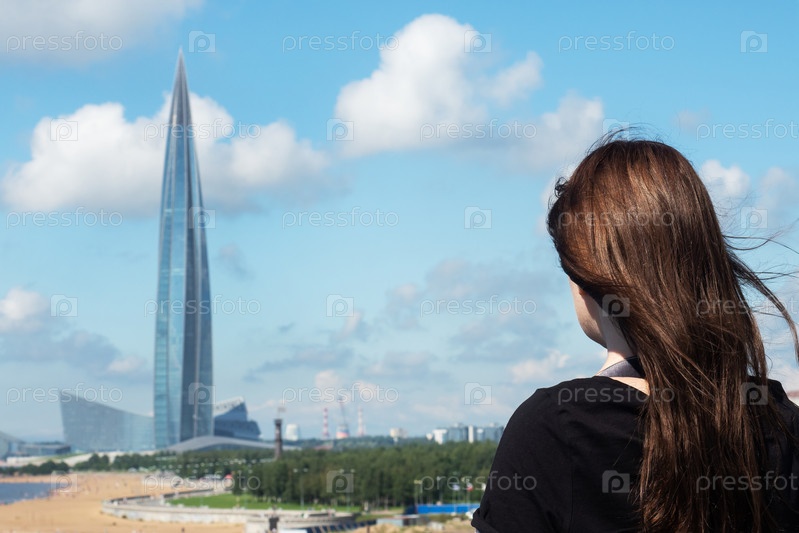Санкт-Петербург, Россия - 7 августа 2020 года: Шатенка стоит спиной и смотрит вдаль на море и башню Лахта-центра в Санкт-Петербурге
