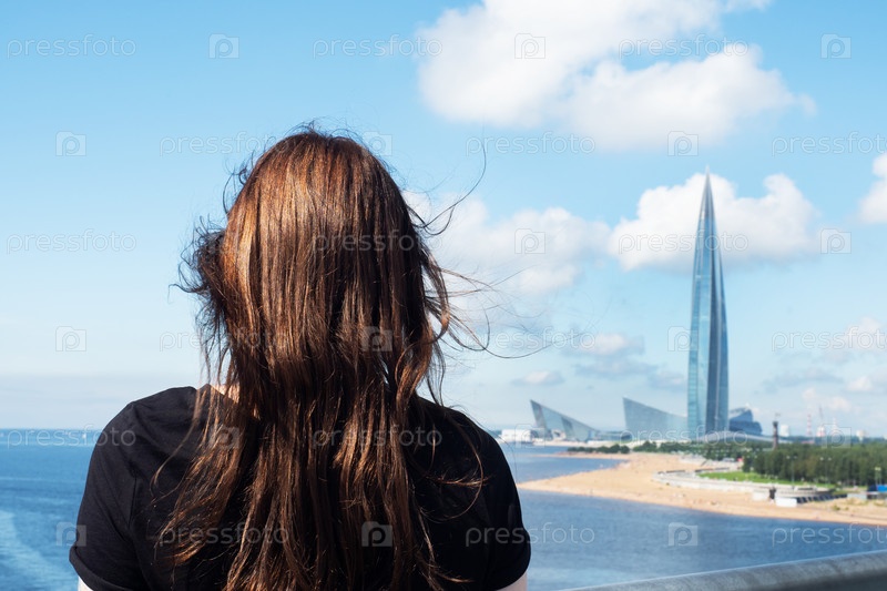 Санкт-Петербург, Россия - 7 августа 2020 года: Шатенка стоит спиной и смотрит вдаль на море и башню Лахта-центра в Санкт-Петербурге