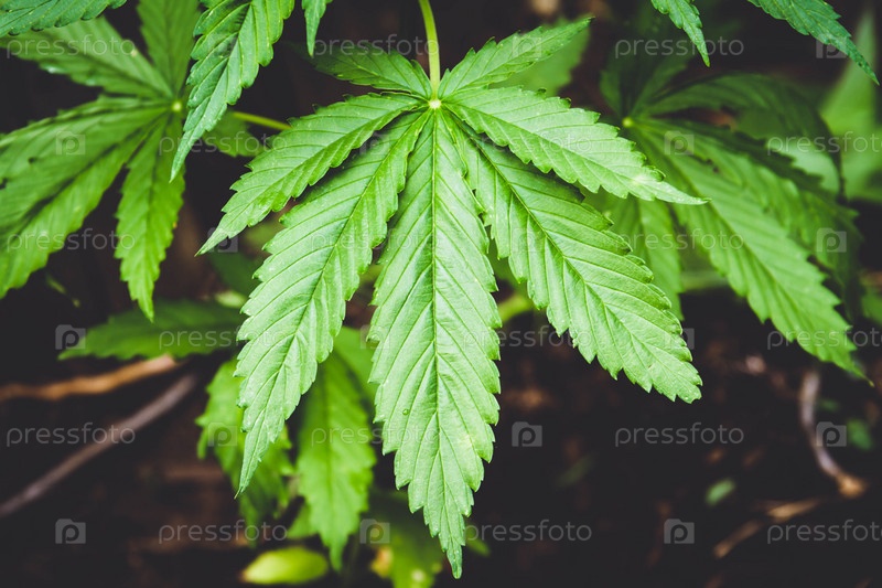 Куст конопли крупным планом. Возделывание полей конопли. Листья фон