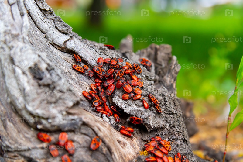 Красные жуки. На пне сидит стая жуков. насекомые на солнце