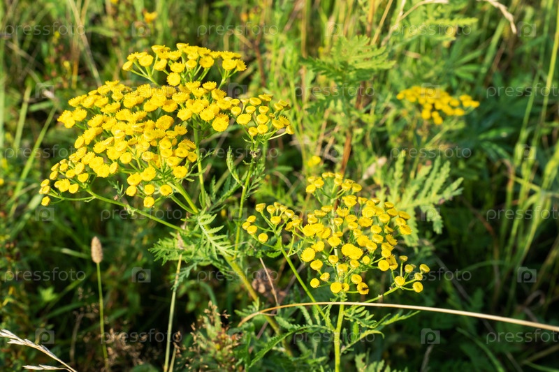 Пижама Tanacetum vulgare, Пиджама обыкновенная, Горькие пуговицы, Горовая горькая, Золотые кнопки сливы, растущие на поле