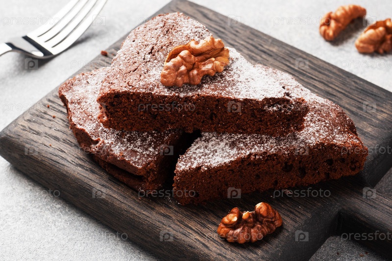 Домашний шоколадный брауни с грецкими орехами. Выпекаем шоколадный торт. копировать пространство