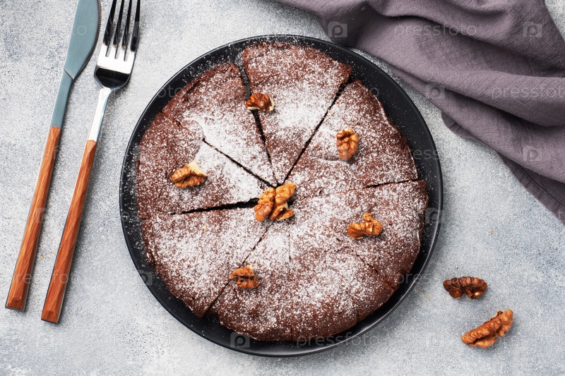 Домашний шоколадный брауни с грецкими орехами. Выпекаем шоколадный торт. копировать пространство