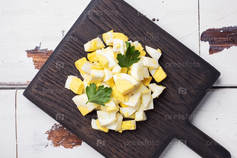 Вареное куриное яйцо мелко нарезанное на деревянной доске с листьями петрушки
