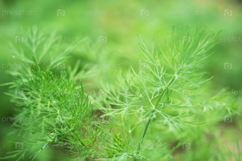 Ароматные зеленые кусты фенхеля, растущие на грядке в саду. Селективный фокус