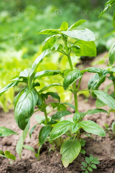 Зеленые листья базилика. Ароматная приправа растет на грядке