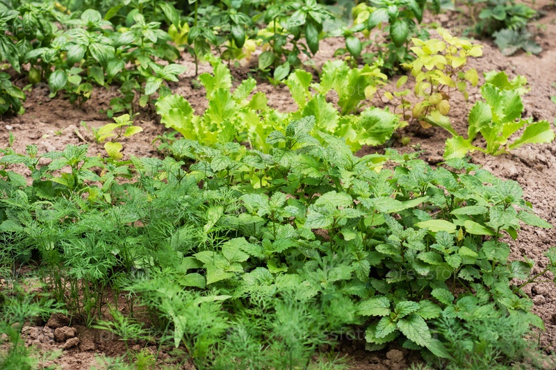 В саду на грядке растут ароматные специи из зеленой травы